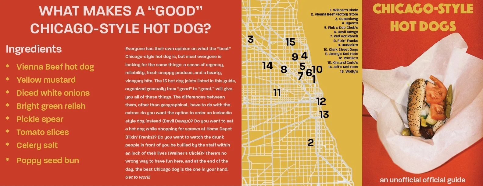 Quadfold editorial layout showcasing my favorite hot dogs across the city (2026).